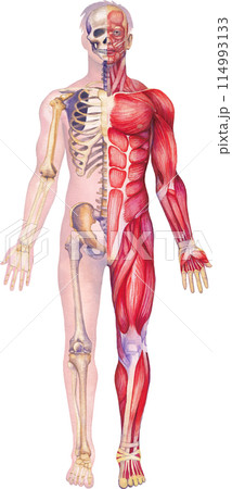 Detailed watercolor illustration of a male human anatomy showing skeletal and muscular systems.