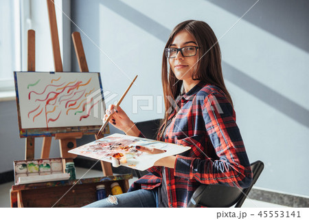Girl 11 years old craftswoman are painting on canvas in studio standing in front of easel. Portrait of a girl painting during an art class.
