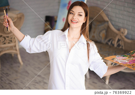 Portrait of female artist holding palette and painting picture on canvas with oil paints in cozy home studio