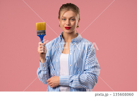 Pretty Smiling Woman Artist Painting With Brush On Pink .Creative Person