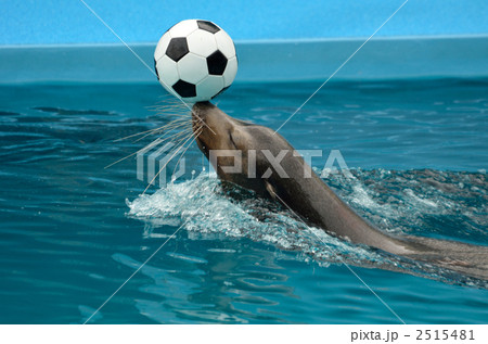 前ひれ1つでプールサイドのステージ台の上で芸をする水族館のショーの風景