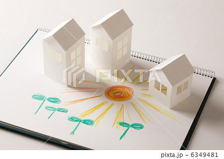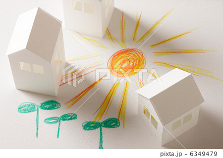 ペーパークラフトの家と双葉と太陽の絵