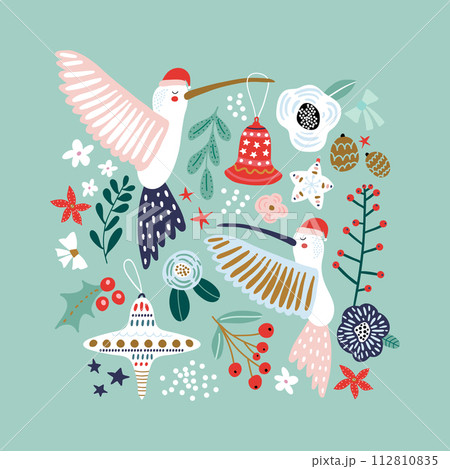 Cute winter greeting background with colibri in santa hat. Winter floral concept. Holiday and christmas illustration. It can be used for greeting card, posters, apparel