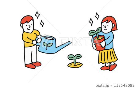 コツコツと苗を大きく育てようとする男女のイラスト 成長・将来・未来・育成・投資などのイメージイラスト