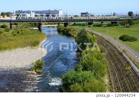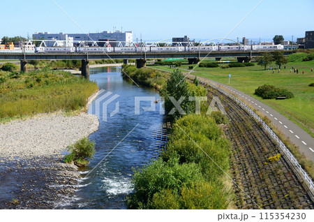 札幌市内を流れる豊平川を渡り旭川へ向かう特急「ライラック」