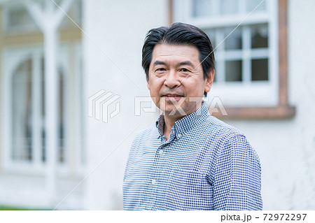 カメラ目線で笑顔の50代後半の男性 撮影協力「LINK FOREST」