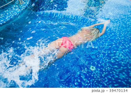 Swimming in hotel pool and blue color water.