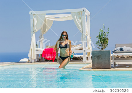 Beautiful young sexy woman by a swimming pool