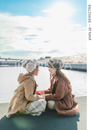 海の見える港で楽しそうに雑談する女性達