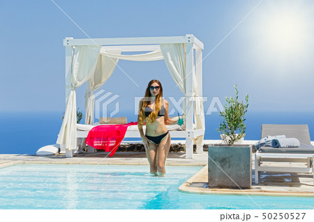 beautiful woman in the pool before the sea at suns