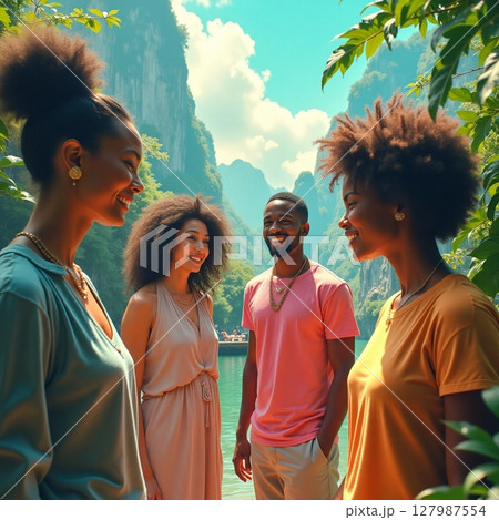 夏の観光地で談笑する外国人たち