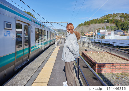 駅のホームで電車を待つ女性 田舎