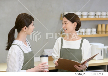 カフェの受付でメニューを見て話し合う女性
