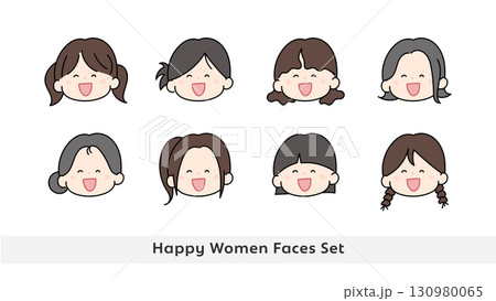 笑顔で嬉しそうなかわいい女性イラスト 顔アイコンセット