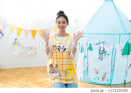 一緒に遊ぶ保育士と園児。撮影協力:有明教育芸術短期大学