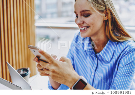 Blonde female tourist checking incoming notification on smartphone sitting on seat of airplane with netbook.Young businesswoman share media from telephone on laptop computer during plane flight