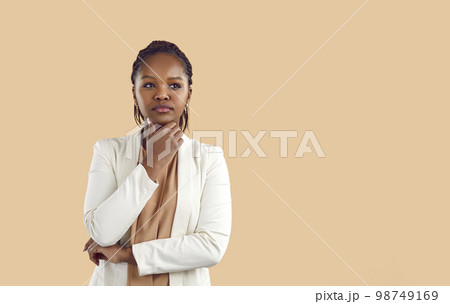 Woman on beige background with pensive expression who is thinking about aplan or has ideas in mind.