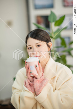 室内で飲み物を飲む若い女性
