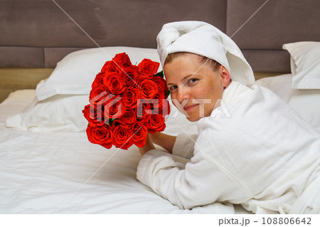 Elegant romance: Stunning girl with a large bouquet of red roses on a hotel bed, relaxation