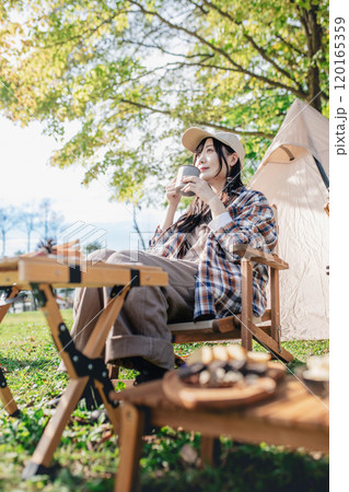 キャンプ場で椅子に座り飲み物を飲みながら休憩する女性