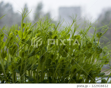 Growing fresh green pea sprouts on wooden windowsill, adding vibrant life to winter kitchen and providing nutritious microgreens for home cooking
