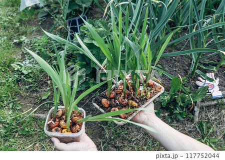Before planting strawberry bush, gardener wearing gloves trims off excess roots with scissors.