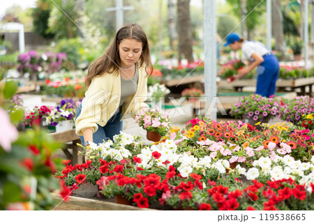 In flower shop, girl chooses flowering petunia atkinsiana plant for outdoor garden decor