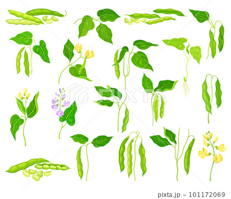 Flowering Bean Plant with Pod and Seeds as Vegetable Crop Big Vector Set