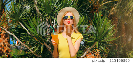 Summer sunny portrait of happy young woman drinking fresh juice with palm tree background