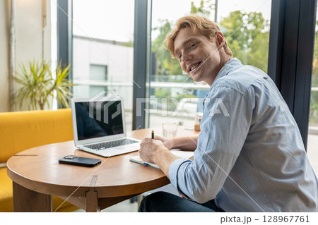 Professional adult Caucasian man wearing suit seated at desk holding laptop explaining concept