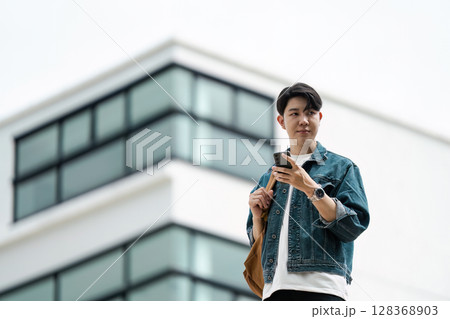 Portrait of nonbinary genderfluid young Asian gay tourist man in bus terminal using phone