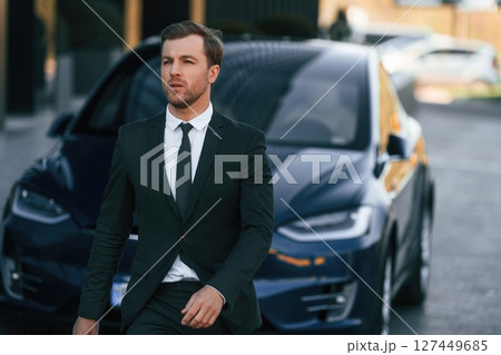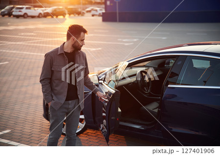 Evening time. Beautiful sunlight. Man is standing near his electric car outdoors