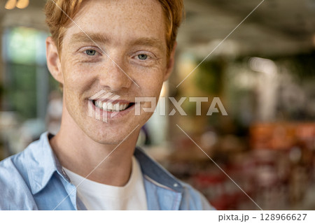 A man with a beard and a red shirt is smiling. He is standing in front of a building