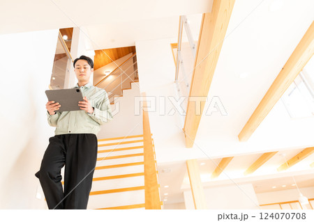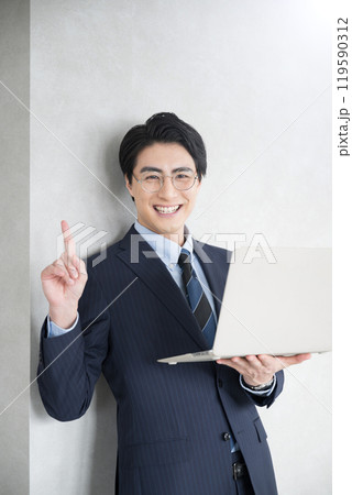 士業や税理士、コンサルタントなどのイメージ パソコンを持つ カメラ目線でポイントやオススメのポーズ
