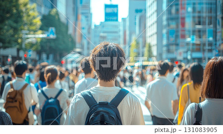 都市の交差点を歩くバックパックの若者の後ろ姿