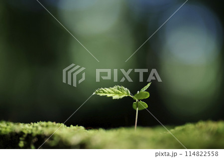 Plants growing from the soil in the forest with a blurred background. Young plant growing in sunlight.