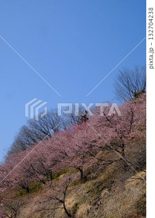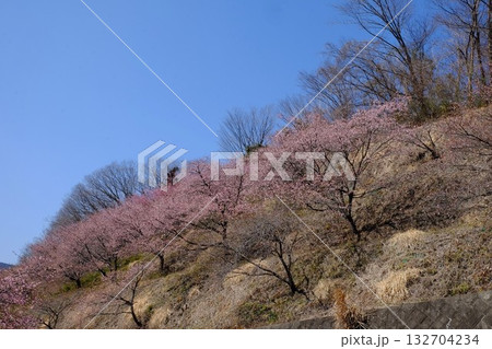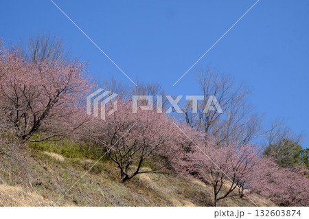 青空を背に山斜面に咲く河津桜 【相模原市津久井 3月】