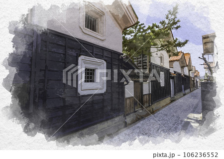 水彩画風 若桜宿 蔵通り 白壁土蔵群 鳥取県八頭郡若桜町