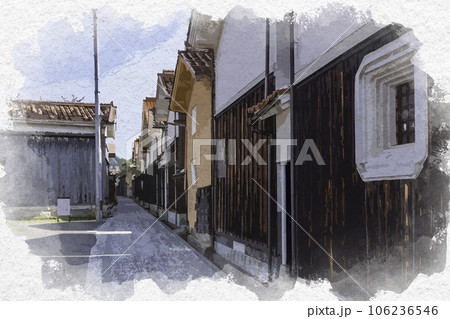 水彩画風 若桜宿 蔵通り 白壁土蔵群 鳥取県八頭郡若桜町