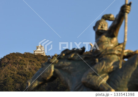 日本の城郭と刀を抜くサムライ 時代劇イメージ 戦国時代