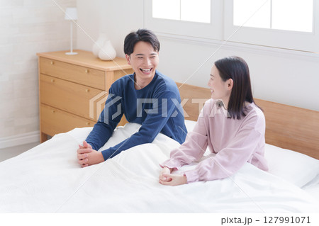 Happy young interracial couple having a cup of coffee on a bed in the morning at home. Romantic people in love, smiling in the bedroom with a warm beverage with loving man and woman in happiness.
