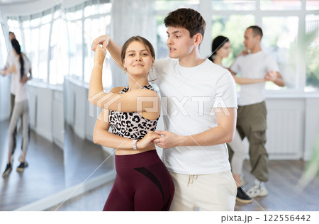 Happy young woman in sportswear with man dancing bachata in ballroom dance class
