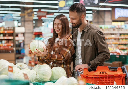 Walking near modern building. Beautiful couple have a shopping day outdoors at daytime