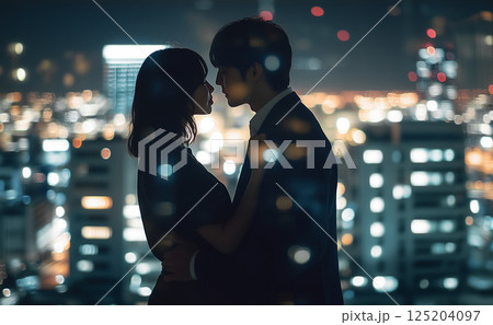 不倫イメージ。スーツ姿の男性と若い女性が夜景を背景にキスするシルエット。浮気現場