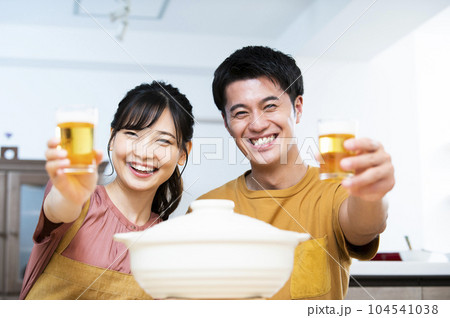 ダイニングキッチンで肩を抱いて列んで立つ若いカップル 新生活イメージ