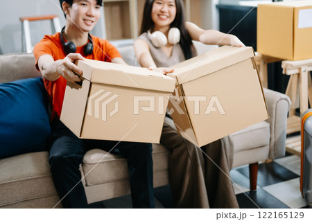 attractive couple man and woman with big boxes moving into a new house, new apartment for couple the new home, Moving house.