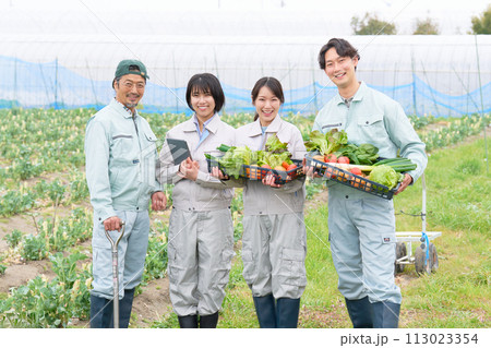農作物をかかえて笑顔を見せるベテラン農夫と若者たち