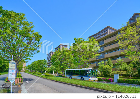 春の東京都稲城市若葉台3丁目の四ツ尾沢緑地付近の若葉台三丁目バス停から若葉台中央通りの北西方面を見る