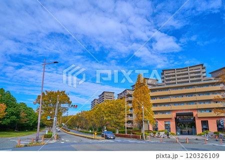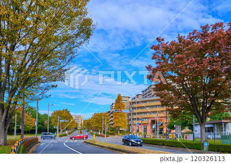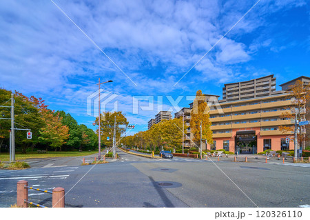 秋の東京都稲城市若葉台2丁目の若葉台駅西交差点付近から北西側の3丁目方面を見る
