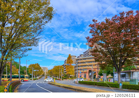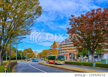 秋の東京都稲城市若葉台2丁目の若葉台駅西交差点付近から北西側の3丁目方面と路線バスを見る